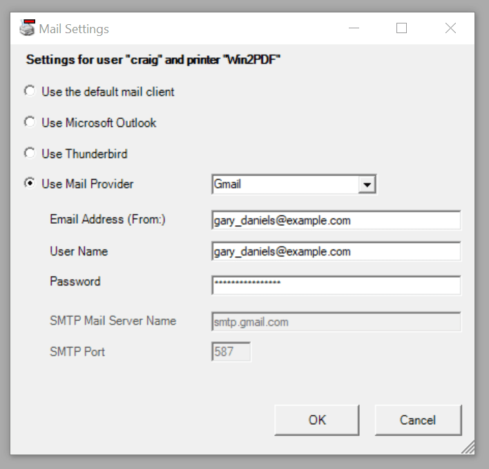 Select "Use Mail Provider" and select "Gmail". Fill in the "Email Address (From:)" and "User Name" fields with your Gmail address. Follow these steps to create an App Password.