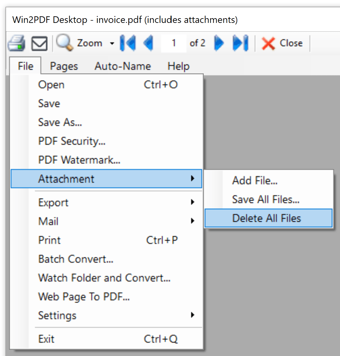 To delete all file attachments from the open PDF, select "Delete All Files" from the "Attachment" menu.