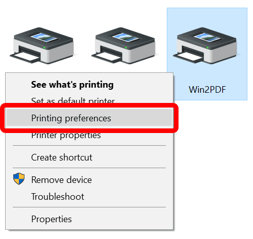 To set the default Win2PDF paper size, open the "Devices and Printers" window, right click on the Win2PDF icon, and choose "Printing Preferences":