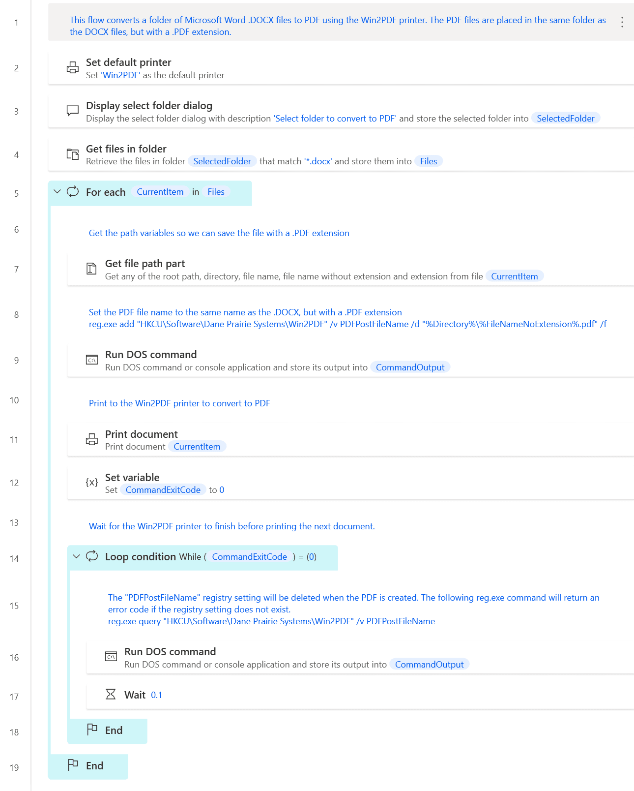 The following flow shows how to convert a folder of Microsoft Word .DOCX files to PDF using the Win2PDF printer. The PDF files are saved in the same location as the .DOCX files, but with a .PDF extension.